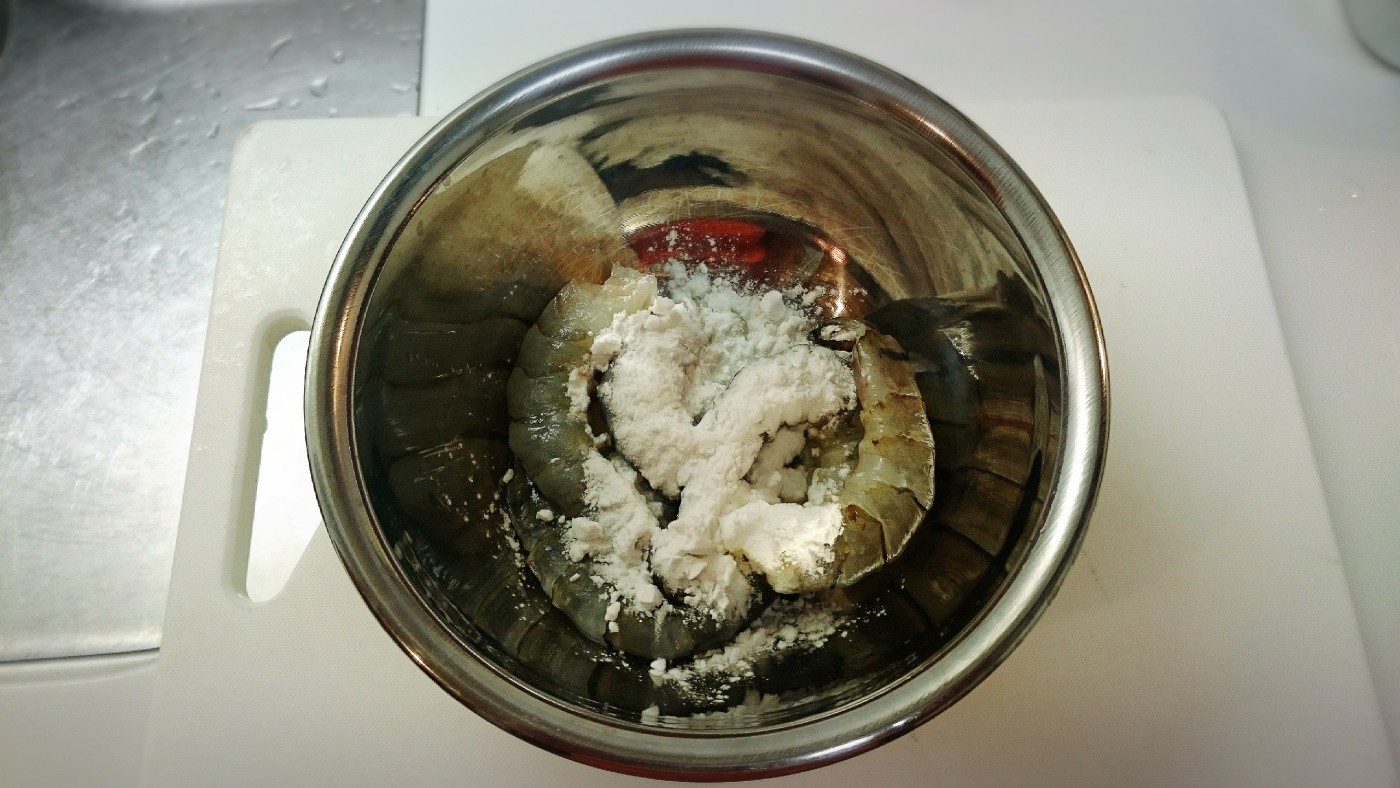 片栗粉をまぶしてください。大さじ1ぐらいね。