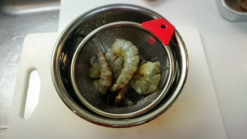 僕の場合、海老は、1匹を4等分、玉ねぎはくし切り、マッシュルームは4等分、