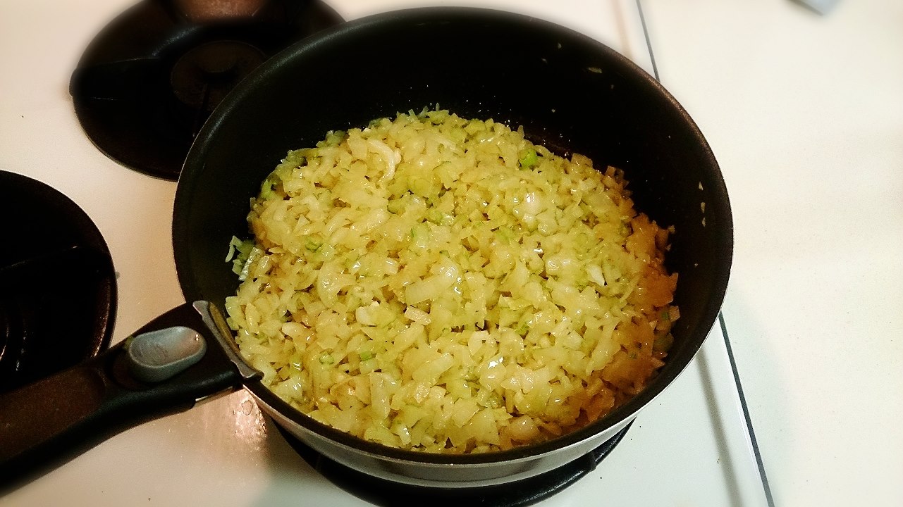 玉葱と、セロリのみじん切りを入れ、混ぜ合わせながら炒めます。