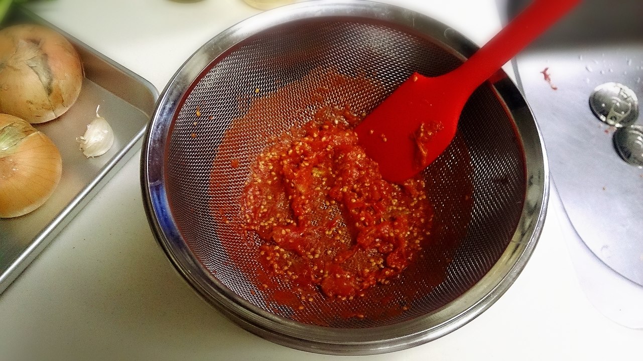 ホールトマトの水煮の缶詰、ボールにざるを載せて、ゴムべらで濾してください。