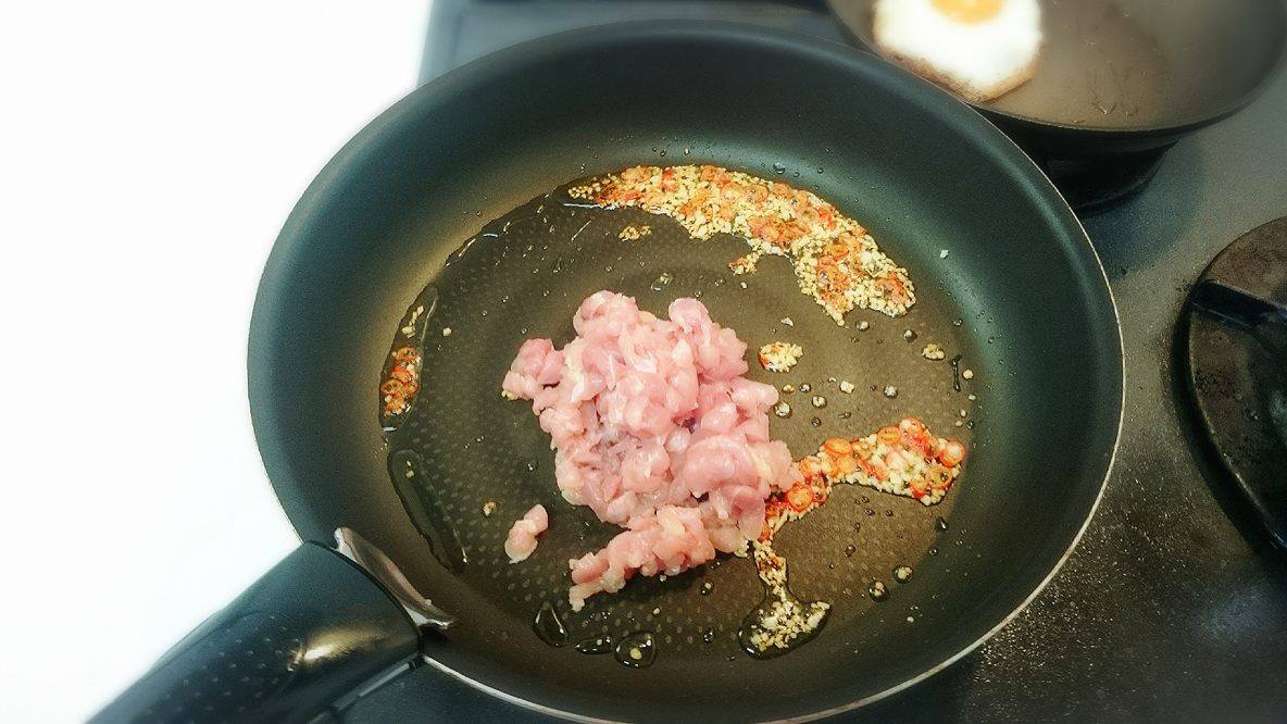 フライパンに、サラダ油を大さじ1入れて、刻んでおいたニンニクと赤唐辛子を、香りを出すように炒めていきます。