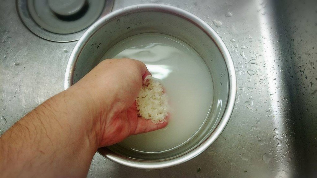 まずは、ジャスミンライスを、たっぷりの水を張ったボウルに入れ、両手で拝むように、優しく拝み洗いします。