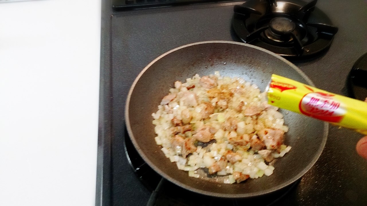 玉ねぎがしんなりしたら、コンソメをふりかけます。