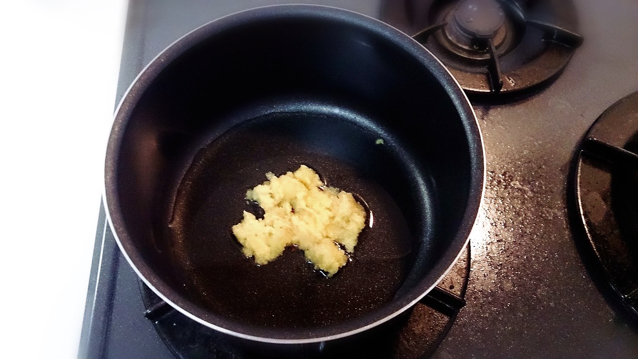 そして、ギーに、すりおろした生姜と、ニンニクを入れて、